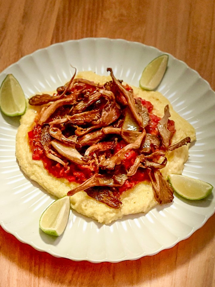 Und die nächste ungewöhnliche, aber hervorragende Kombi ist das Angu – die brasilianische Form der Polenta. Ganz einfach zu machen: Kokosmilch und Wasser werden in einen Topf gegeben, dann kommt 2-Minuten-Polenta, reichlich Parmesan, Olivenöl, Knoblauch, etwas Currypulver und Salz dazu. Alles verrühren und unter Rühren erhitzen bis sich alles gut angedickt vom Topfboden löst.