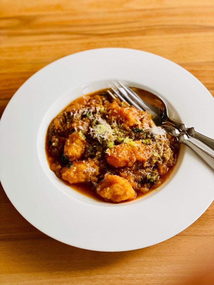 Für die Gnocchi werden die Kartoffeln ebenfalls aus der Schale gelöffelt, alles mit Gabel zerdrückt, dazu kommt ein Eigelb und Maismehl. Gewürzt wird mit reichlich Pfeffer und Muskat. Das Ergebnis bleibt relativ feucht. Die Gnocchi dürfen erst sieden und dann werden sie mit etwas Kochwasser zum Auberginenragout gegeben und noch mal erhitzt, damit sich alles schön verbindet. Serviert wird mit Parmesan und abgeriebener Zitronenschale. 😋