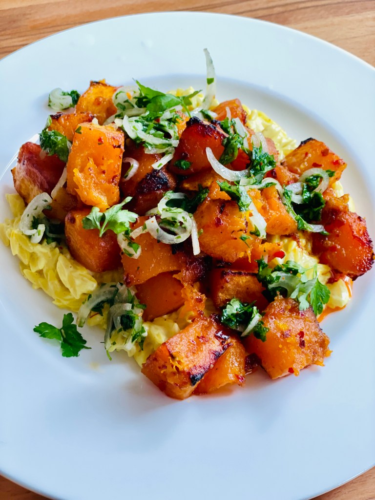 Ein tolles, besonderes Essen – und so einfach nachzukochen. Der Butternutkürbis wird geschält und gewürfelt in eine Ofenform gegeben und mit ganzen Chilischoten, Zimtstangen, Butter, Olivenöl, heller Misopaste, Rosenharissa und Ahornsirup sowie etwas Salz vermengt. Alles wird gut mit Alufolie verschlossen und darf zunächst 15 Minuten schmoren, dann kommt Alufolie weg und die Chilischoten raus und es darf noch mal 25 Minuten offen weiter schmörgeln.