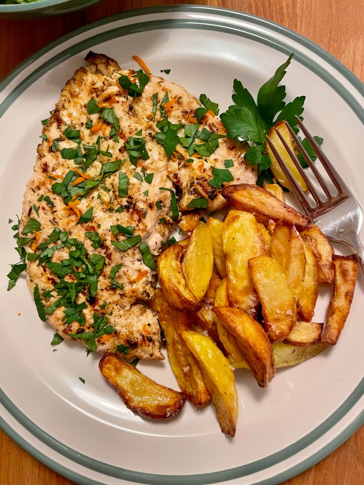 Dazu gab es Kartoffelspalten aus dem Airfryer und Feldsalat mit Honig-Knoblauch-Dressing. Ratzfatz auf dem Tisch, megazart und wirklich sehr, sehr schmackhaft.