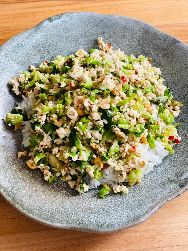 Der Tofu wird grob geraspelt und trockengetupft. Der Rosenkohl wird halbiert und in Scheiben geschnitten und dann mit Chili und Knoblauch angebraten. Dann kommt der Tofu dazu und eine Sauce aus Limettensaft und -schale, Fischsauce, Sojasauce und braunem Zucker. Zum Schluss werden noch Frühlingszwiebeln, gehackte Erdnüsse und Thaibasilikum untergehoben – wirklich superlecker. Der Rosenkohl und auch das Tofu entwickeln eine ganz neue geschmackliche Tiefe, die ich so noch nicht gegessen habe. Wirklich richtig gut und ist zufällig vegan (wenn man No-Fish-Sauce benutzt).