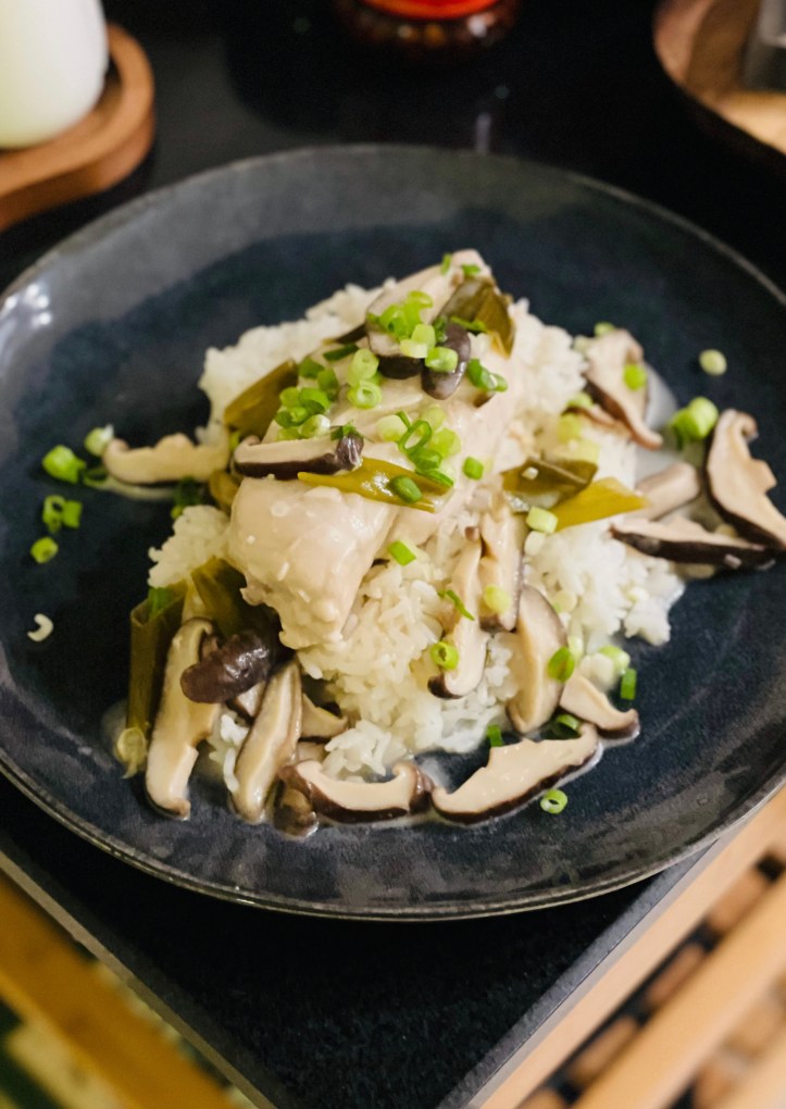 Melissa Clark empfiehlt es auch als Familienessen mit Kindern, weil es wirklich ganz mild ist. Kokosmilch wird mit Limettensaft, Fischsauce, Zitronengras und Knoblauch aufgekocht und darin darf dann erst die Hühnerbrust kurz angaren, bevor Shitakepilze und Frühlingszwiebeln dazu kommen. Insgesamt dauert das alles keine Viertelstunde. Ich habe noch mit einem Hauch Palmzucker und etwas Chili abgeschmeckt.
