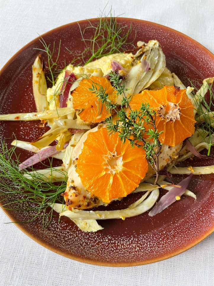 Und statt eines ganzen Huhns in Teilen zerlegt, gab es hier nur Filets, die verarbeitet werden wollten. Deswegen musste ich das Rezept etwas anpassen und z.B. Zwiebeln und Fenchel, die übrigens mit mariniert werden, deutlich dünner schneiden. Die Marinade besteht aus Whisky, Zitronensaft, Fenchelsaat, Thymian, grobem Senf, Orangenschale, etwas Chili, Zucker, Salz und Pfeffer. Sie ist wirklich sehr gut und Gemüse und Huhn dürfen über für einige Stunde darin ruhen.Dann wird das Ganze aus der Marinade genommen und auf einem Backbleck verteilt und im Ofen geschmort, später unter dem Grill (was bei Verwendung eines ganzen Huhns sicherlich Sinn macht) und die Orangenscheiben dürfen im Originalrezept separat im Ofen mit einer Zuckerauflage karamellisiert. Ich habe die Orangen gleich mit auf Fleischstücke gegeben und das hat mit den Filets auch gut geklappt.