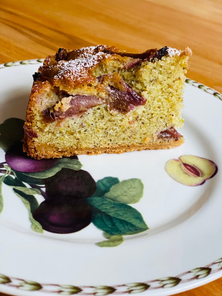 Ich habe mich der Form widersetzt und das Ganze einfach als runden Kuchen gebacken. Ein sehr feiner Mürbeteig gibt einen wunderbaren Knusperboden, darauf kommt ein ebenso feiner Rührteig mit viel Butter, Eiern, Zitronenabrieb und Pistazien und Mandeln. Ich habe Zwetschgen statt roter runder Pflaumen verwendet, die Frucht begleitet hier sanft – ganz feiner, toller Kuchen.