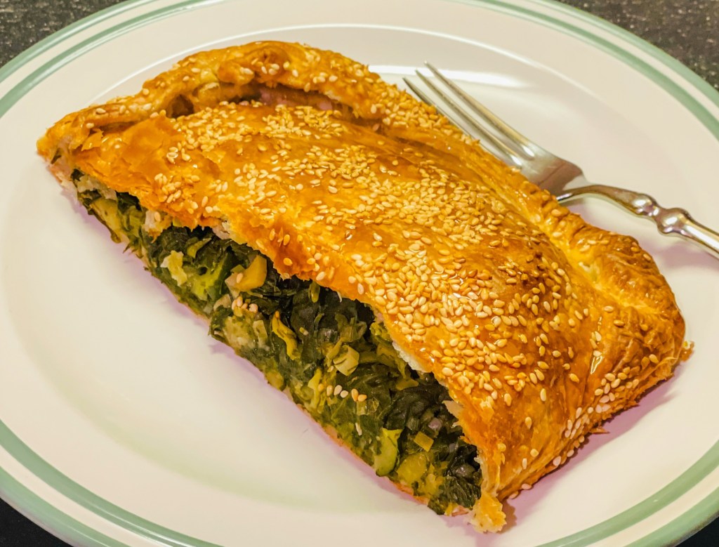 Etwas Zeit braucht es, denn der Hefeteig muss gehen und für die Füllung werden Zucchini, Lauch, Lauchzwiebeln und Babyspinat gesalzen und geknetet und das Gemüse darf dann gut 30 Minuten ruhen (und immer mal wieder zwischendurch geknetet werden), bis es schön zusammengefallen ist. Dann gut ausdrücken und mit Zitronensaft reichlich Dill, Petersilie, und weißem Pfeffer würzen. Zerstoßene Fenchelsaat sollte eigentlich auf die Pastete, ich hatte sie schon schwungvoll in Mischung geworfen – tat dem guten Geschmack keinen Abbruch. Die Pastete mit Olivenöl bestreichen und mit Sesam bestreuen – und ab in den Ofen. Nach dem Backen mit reichlich Honig beträufeln – unbedingt machen, das gleicht die Säure wunderbar aus und bringt eine wunderbare Balance in das Ganze.