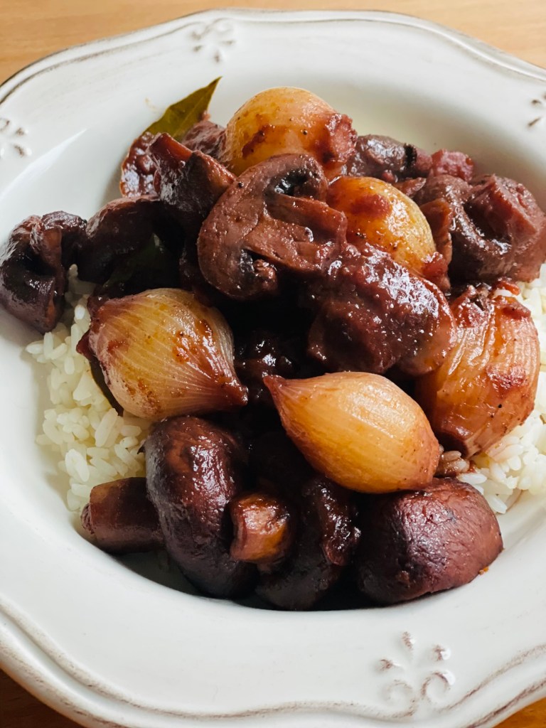 Eine tolle vegane Variante von Stifado – hier mangels Wildpilzen mit Champignons. Die kleinen Zwiebeln werden erst kurz mit Schale aufgekocht, damit man dieselbe dann besser entfernen kann, ohne die Zwiebel zu beschädigen. Dann werden sie in Olivenöl angedünstet, Knoblauch in Scheiben und Piment kommen dazu und dann schließlich die Pilze und frischer Thymian und alles darf weiter schmoren, bis es dann schließlich mit Rotwein abgelöscht wird und noch eine Zimtstange und Lorbeer dazu dürfen. Nachdem alles ein wenig eingekocht ist, kommen noch Tomatenpassata und Rotweinessig hinzu und dann darf alles für gute 45 Minuten in den Backofen.