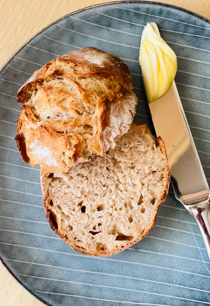Tolle Sache – der Teig wird am Vorabend mit nur 1 g Hefe angesetzt, vorwiegend mit Weizenmehl und einem kleinen Anteil Roggen- und Weizenvollkornmehl. Und er wird nur gerührt (am besten mit dem dänischen Schneebesen) – man muss keine Maschine bewegen. Zweimal innerhalb der ersten zwei Stunden dehnen und falten. Ins Bett gehen…
