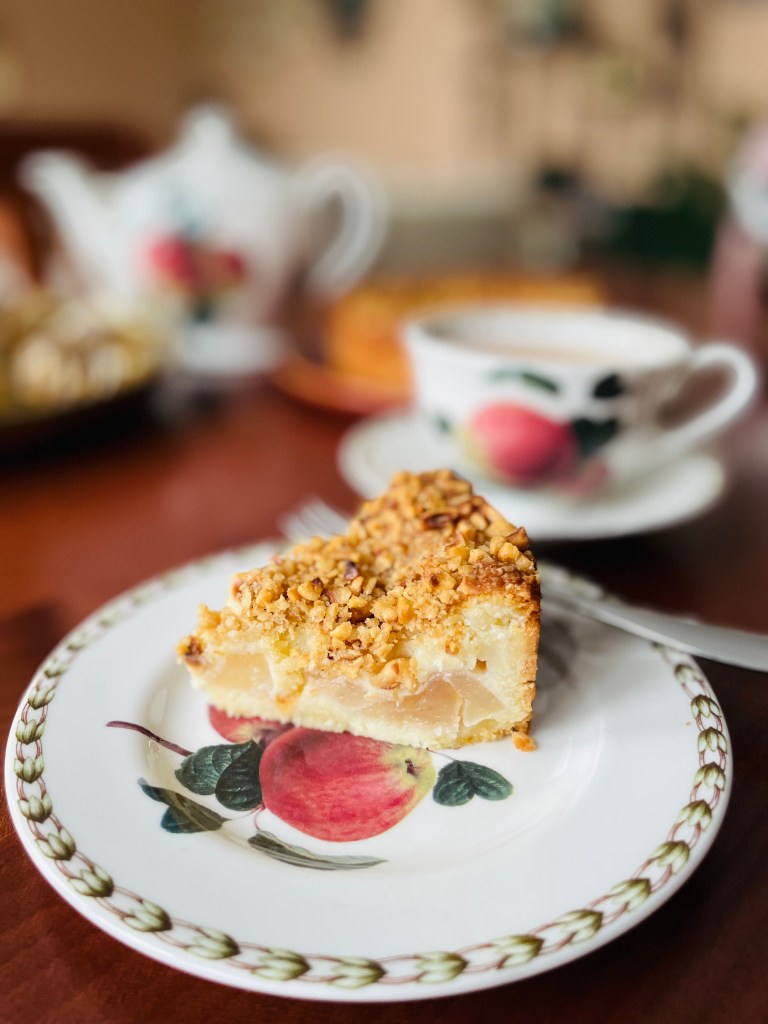 Und auch für diesen Klassiker hat Madeleine ein tolles Rezept! Und ich hatte noch schöne „Finkenwerder Herbstprinz“-Äpfel da… 🥰 Erst macht man einen schönen süßen Mürbeteig mit Ei, Vanille und Zucker und für die Füllung halbiert oder viertelt man die Äpfel und darauf kommt eine besondere Creme. Für die schlägt man Butter, Zucker und Zitronenschale und etwas -saft hell auf. Dann hebt man Mehl, das mit etwas Backpulver versetzt ist, unter und zieht steifgeschlagene Sahne darunter.