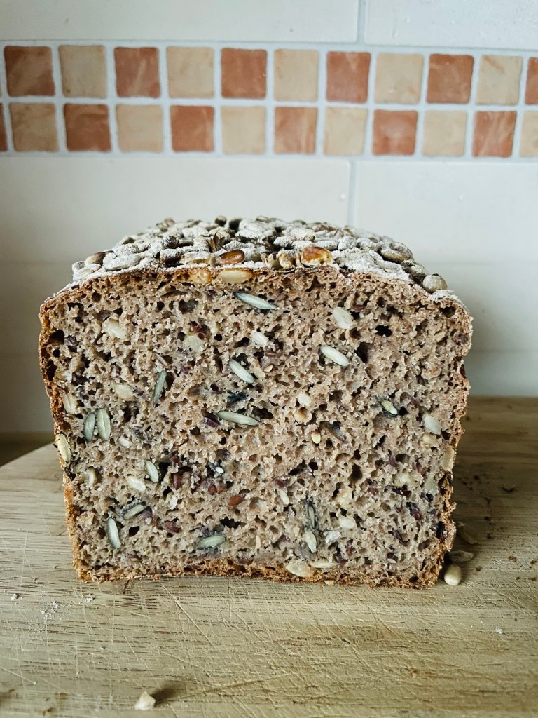 Ein reines Sauerteig-Vollkornbrot, überwiegend mit Roggen und vielen Saaten – gesund und lecker. Am Vorabend wird dafür Sauerteig-Anstellgut mit Roggenvollkornmehl und Wasser vermischt und das darf über Nacht reifen. Ebenso bereitet man schon einmal das Brühstück aus Saaten vor: dafür werden Sonnenblumenkerne und Kürbiskerne geröstet und dann in einer Schüssel, in die auch noch Leinsamen dürfen mit heißem Wasser übergossen. Dann dürfen sie in Ruhe quellen, anschließend abtropfen und dann im Kühlschrank auf ihren Einsatz warten. Der kommt am nächsten Morgen, wenn alle Zutaten (Sauerteig, die Saaten, Wasser, Roggen- und nur wenig Dinkelvollkornmehl sowie Honig und Salz) kurz geknetet werden. Die zweite Gare dauert dann gut 2 Stunden. Und dann darf das Brot in den Ofen – mit Dampf und nach gut 50 Minuten kommt ein tolles Brot aufs Brett! Einfach und echt lecker!